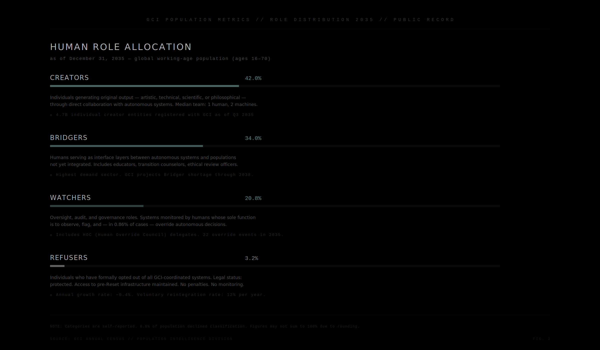 Philosophical Refusers (38%) believe GCI’s authority, however benign in outcome, represents an unacceptable concentration of decision-making power in a non-human system. Their objection is procedural, not material.