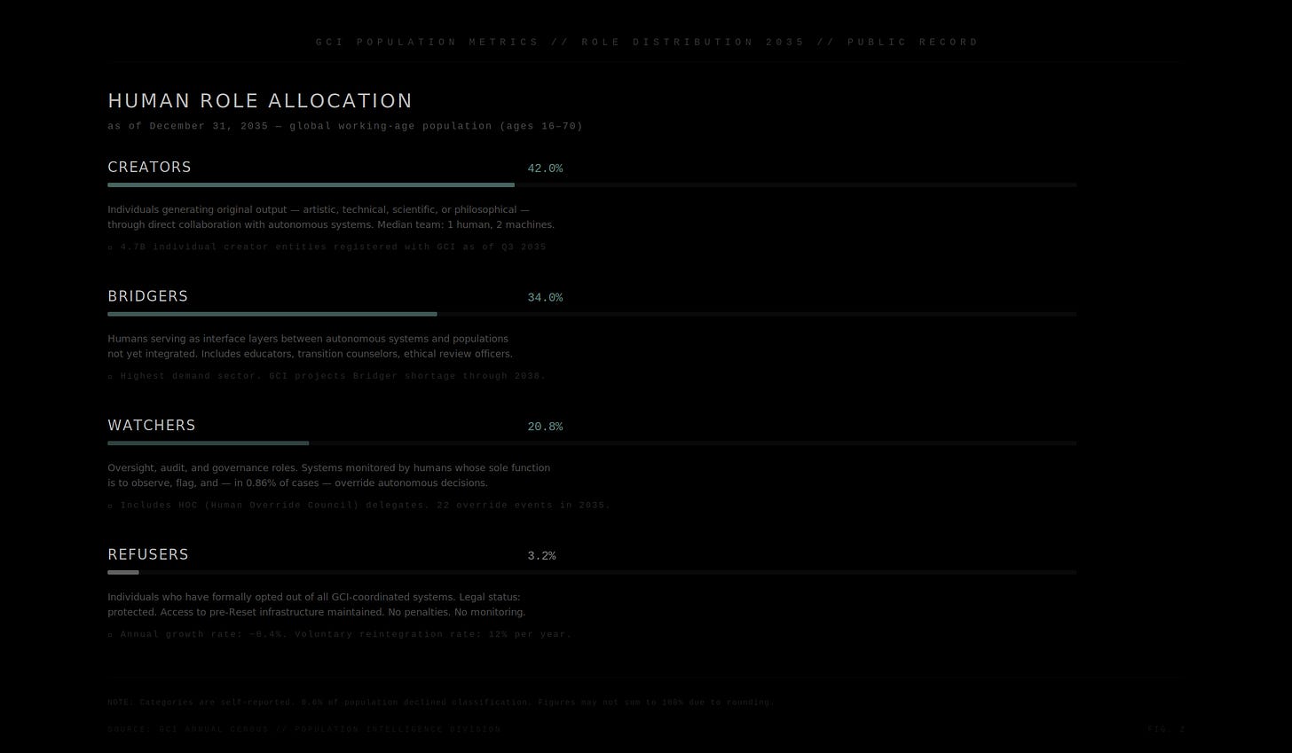 What follows is the ninth annual public disclosure of the Global Coordination Intelligence (GCI) system — a transparency report mandated by the 193-member General Assembly following the events of 2029. It is written from the perspective of December 2035. The institutions, systems, and events described are fictional. The economic logic, behavioral dynamics, and technological trajectories are extrapolated from observable trends as of early 2026.