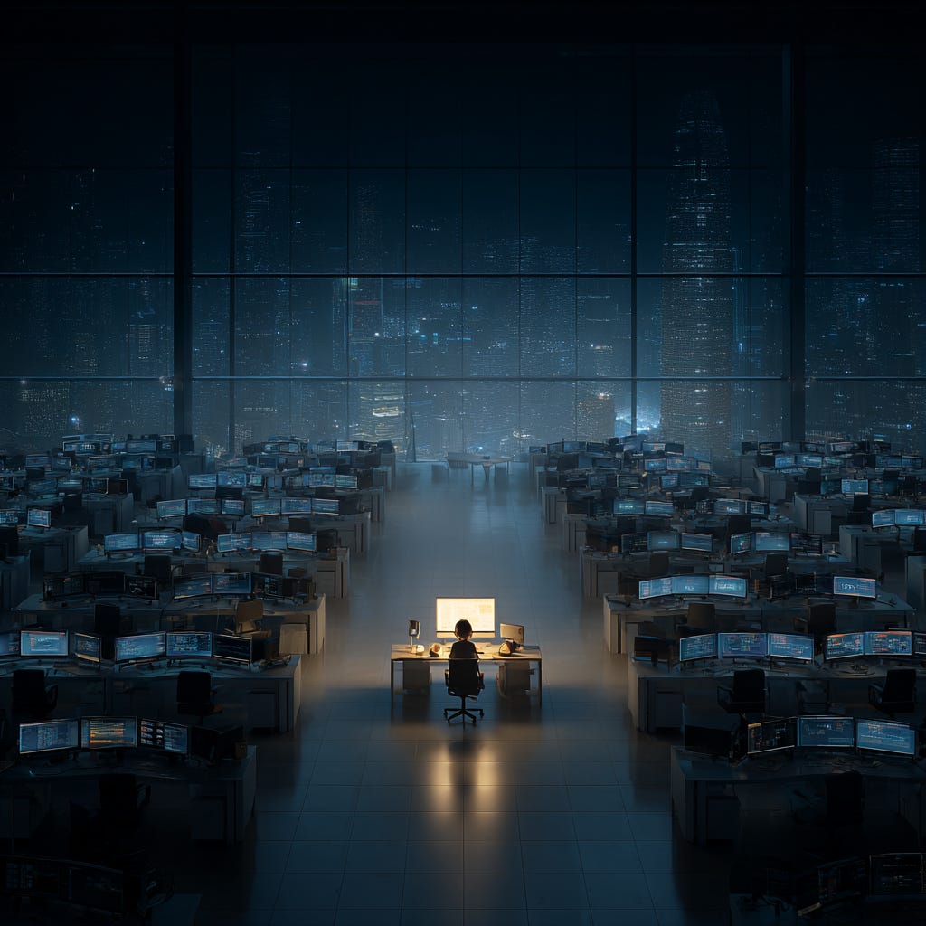 This document is a work of speculative fiction published for purposes of intellectual exploration and public discourse. It does not constitute investment advice, financial guidance, or a recommendation to buy, sell, or hold any security or financial instrument. All references to existing companies, institutions, and organizations are used in a fictional, speculative context and do not represent factual claims about those entities’ current or future operations, strategies, or financial condition. All numerical figures, percentages, and headcount references associated with named entities are entirely fictional and are not based on any non-public information, internal projections, or proprietary data. The scenarios described are hypothetical and are not intended as predictions. The author has no inside knowledge of any company’s workforce plans, financial condition, or strategic direction. Readers should consult qualified financial and legal professionals before making any investment or business decisions. Past speculative scenarios — including those by other publications referenced herein — have no predictive validity regarding actual market outcomes.