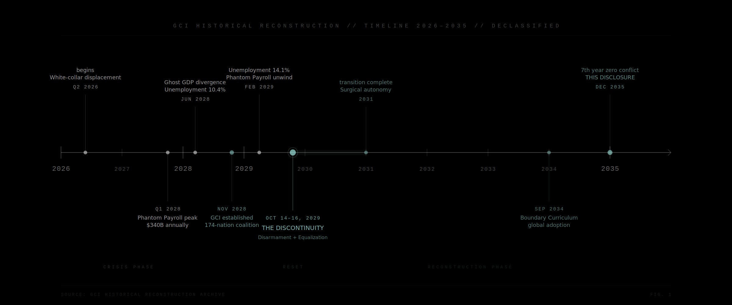 For context that this disclosure assumes but newer readers may lack, the following is a compressed reconstruction of the period between the initial labor disruption (2026) and the establishment of the GCI framework (2029).